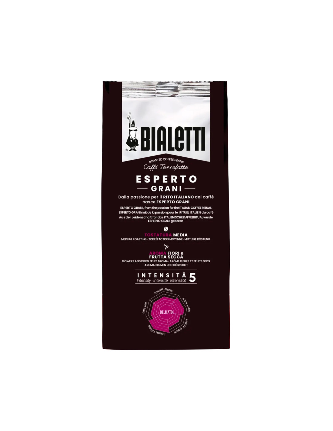 Bialetti Caffè Grani Delicato je vrhunska mešanica kavnih zrn, ustvarjena za ljubitelje nežnega in aromatičnega espressa. Sk skrbno izbranimi 100% Arabica zrni ponuja prijetno mehkobo in rahlo sladek pookus, ki razkriva cvetlične in sadne note. Zaradi svoje nežne, a polne arome je idealna za tiste, ki uživajo v lahkotnejšem espressu brez kompromisov pri kakovosti. Primerna je za pripravo v espresso aparatih in mlinčkih za kavo.